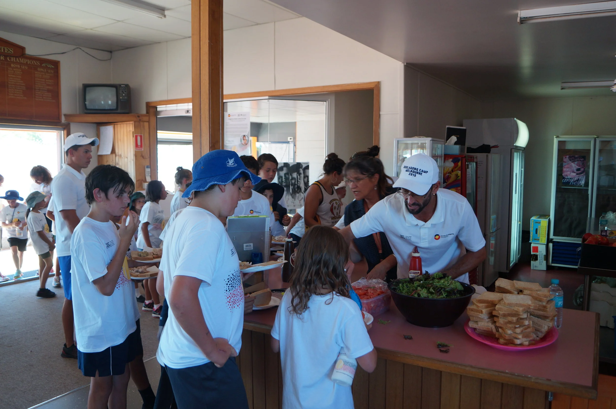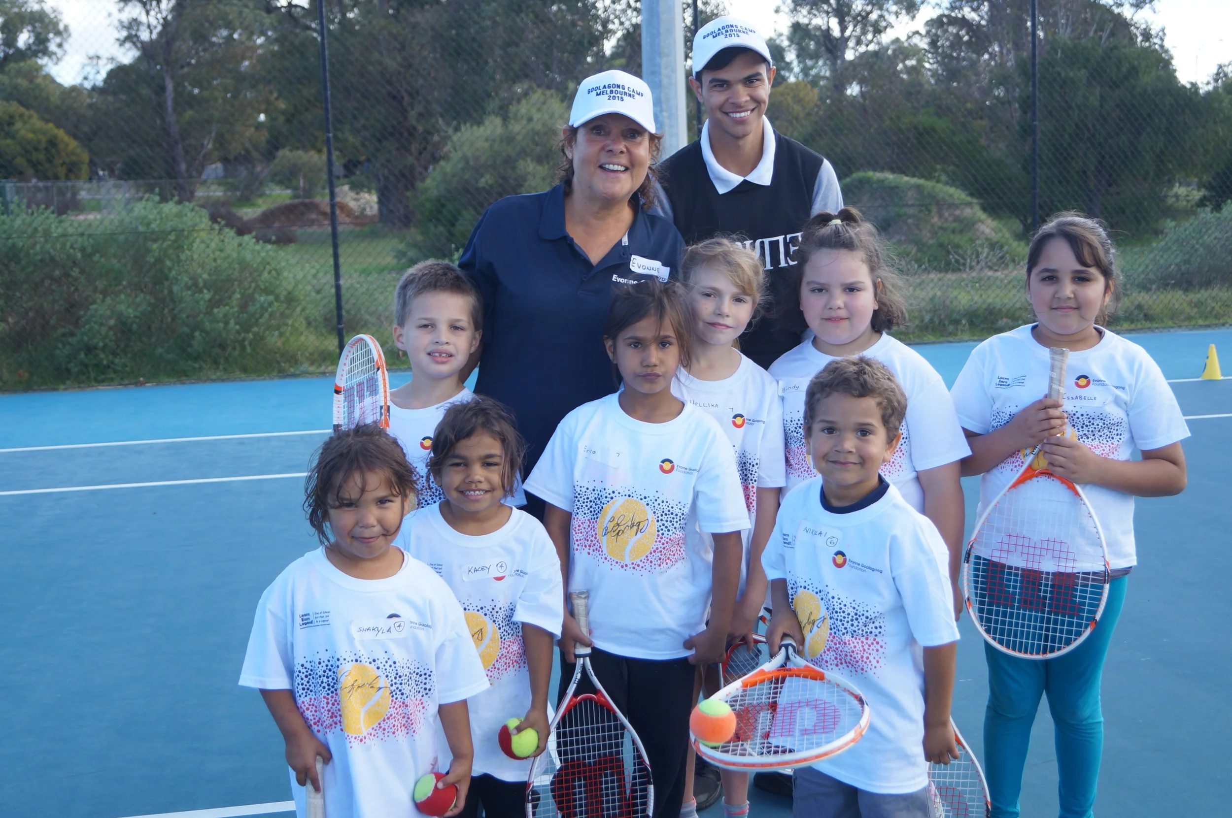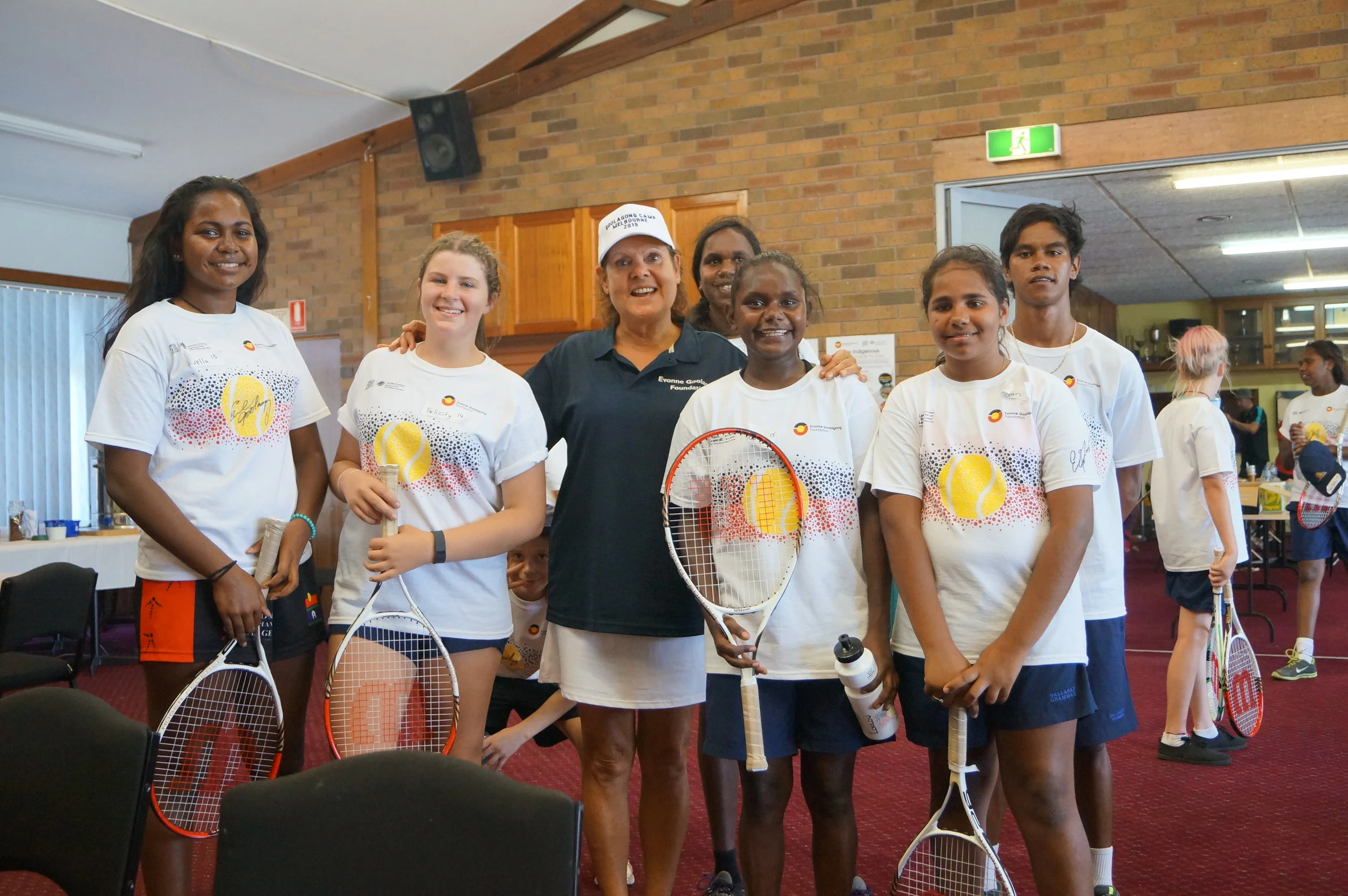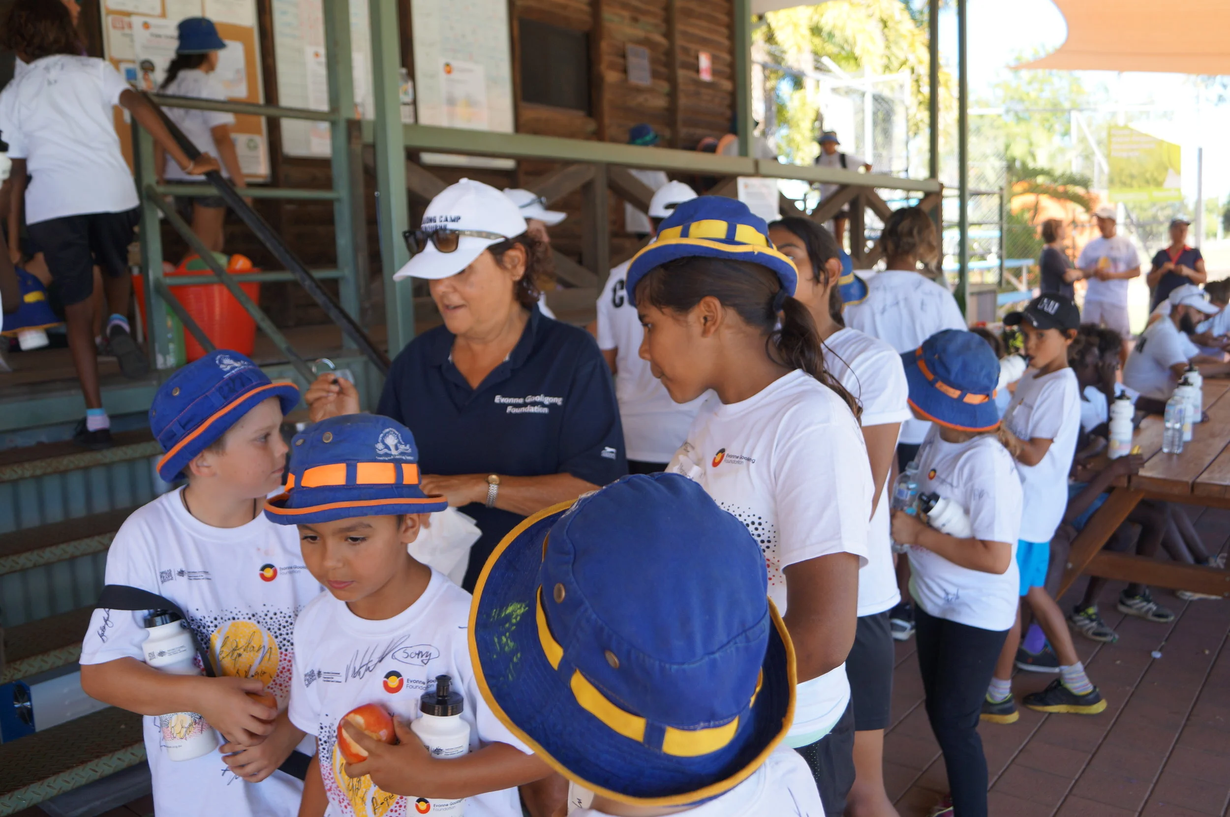 Evonne and EGF Board Member Elaine Lomas (in red) welcome youngsters in Canberra